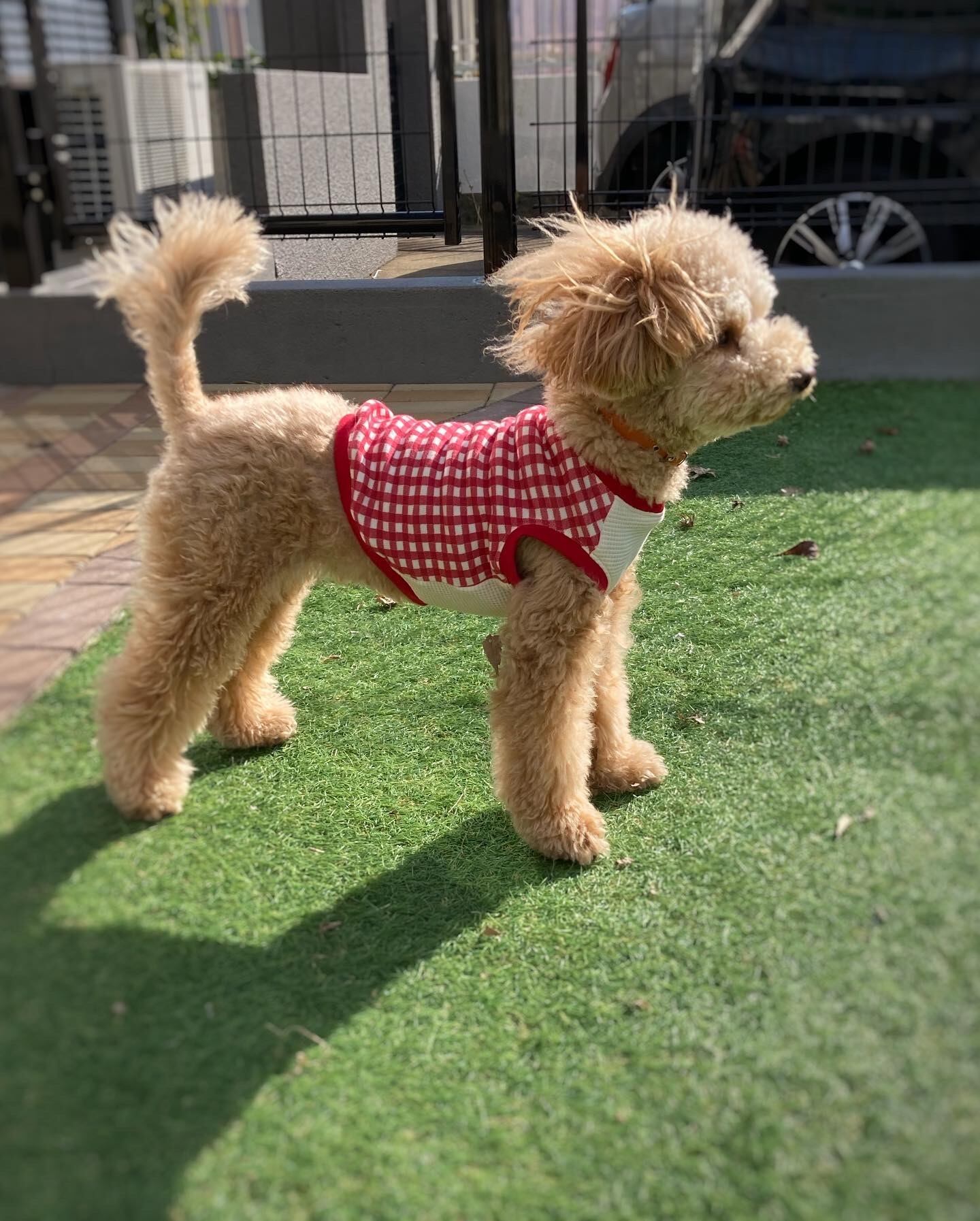 背中はミニギンガムチェック柄のスムースニット、トマトレッドのお色でパワーチャージ!