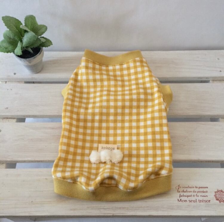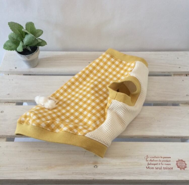 背中はミニギンガムチェック柄のスムースニット、マスタードイエローのお色が渋可愛いです。
