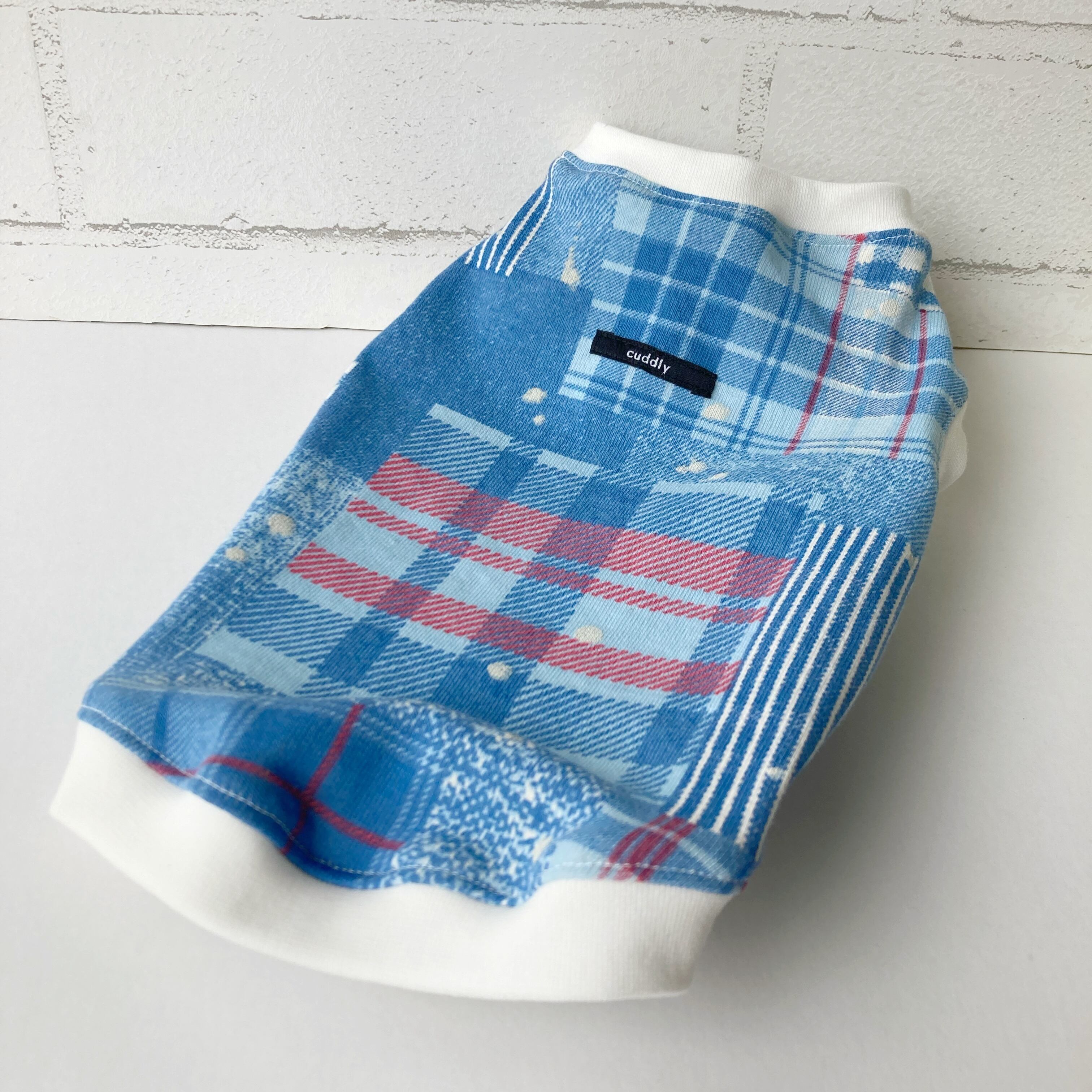 ヴィンテージデニムとチェックのパーツをミックスしたグランジデニムの上に、ペンキを飛ばしたような、カラフルで元気なデニム柄です。